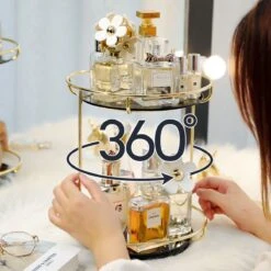 Deze verfijnde make-up / parfum organizer bestaat uit 2 lagen met messing frame. Het unieke aan deze organizer is dat deze voorzien is van een 3600 draaiplateau, waardoor je al je mooie producten in een handomdraai kunt pakken. De glasplaatjes zijn van zwart rookglas.