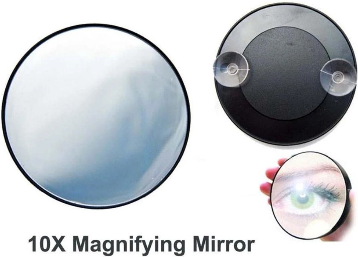 Fijne make-up spiegel met zuignappen en een vergrotende werking van 10x om nog beter te letten op kleine oneffenheden tijdens het opmaken, scheren of andere verzorgingsactiviteiten.