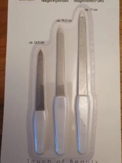Nagelvijlenset 3-delig op blisterkaart. Handig om mee te nemen op o.a. vakantie, en eenvoudig mee te nemen in toilettas.