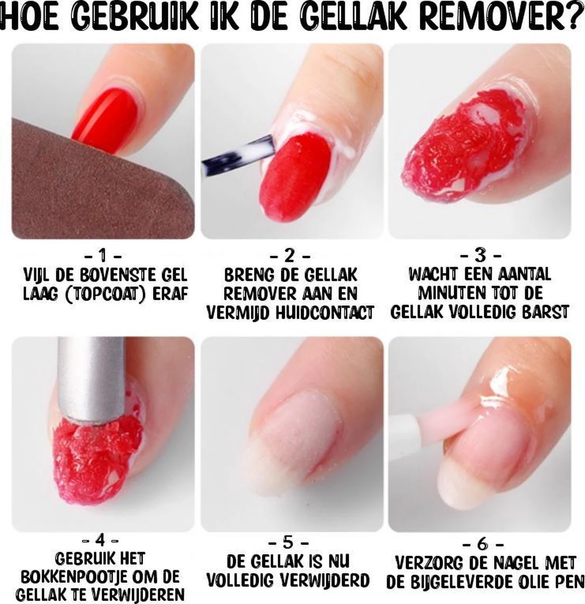 Het proces is gemakkelijk en snel! Vijl je nagels grondig om de bovenste laag nagellak, oftewel de top coat, te verwijderen. Breng hierna een laag Magische Gellak Remover aan op de gellak en laat het ongeveer 5 minuten intrekken. De gel begint te borrelen en af te pellen, waardoor het moeiteloos afgeschraapt kan worden met het bijgeleverde stalen bokkenpootje. Was u handen altijd onmiddellijk na gebruik. Sluit het deksel na gebruik goed om te voorkomen dat de gelpasta opdroogt.