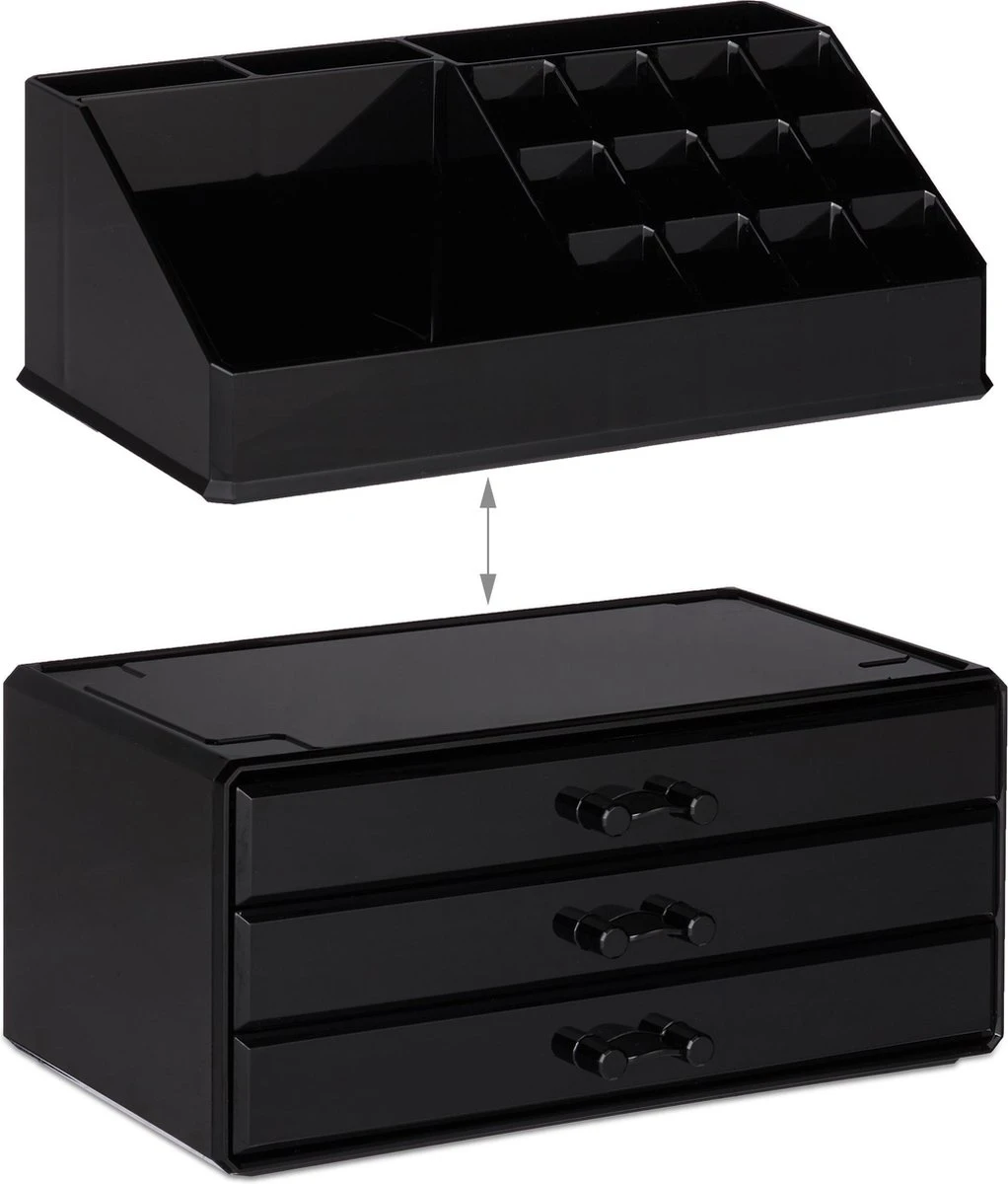 De kleine make-up organizer creëert ruimte op de kaptafel en bespaart je het zoeken in je toilettas. De tweedelige make-up standaard biedt met in totaal 19 vakjes veel opslagruimte voor cosmetica en sieraden. De lades zijn geschikt voor crèmes, poeder en oogschaduw, alsook voor horloges, kettingen en armbanden. De praktische houder voor lippenstift is ook geschikt voor nagellak, borstels, stiften en nog veel meer. De houder doet het ook zeker goed als bureau-organizer voor kantoorartikelen of als opbergruimte voor schroeven en ander klein gereedschap.