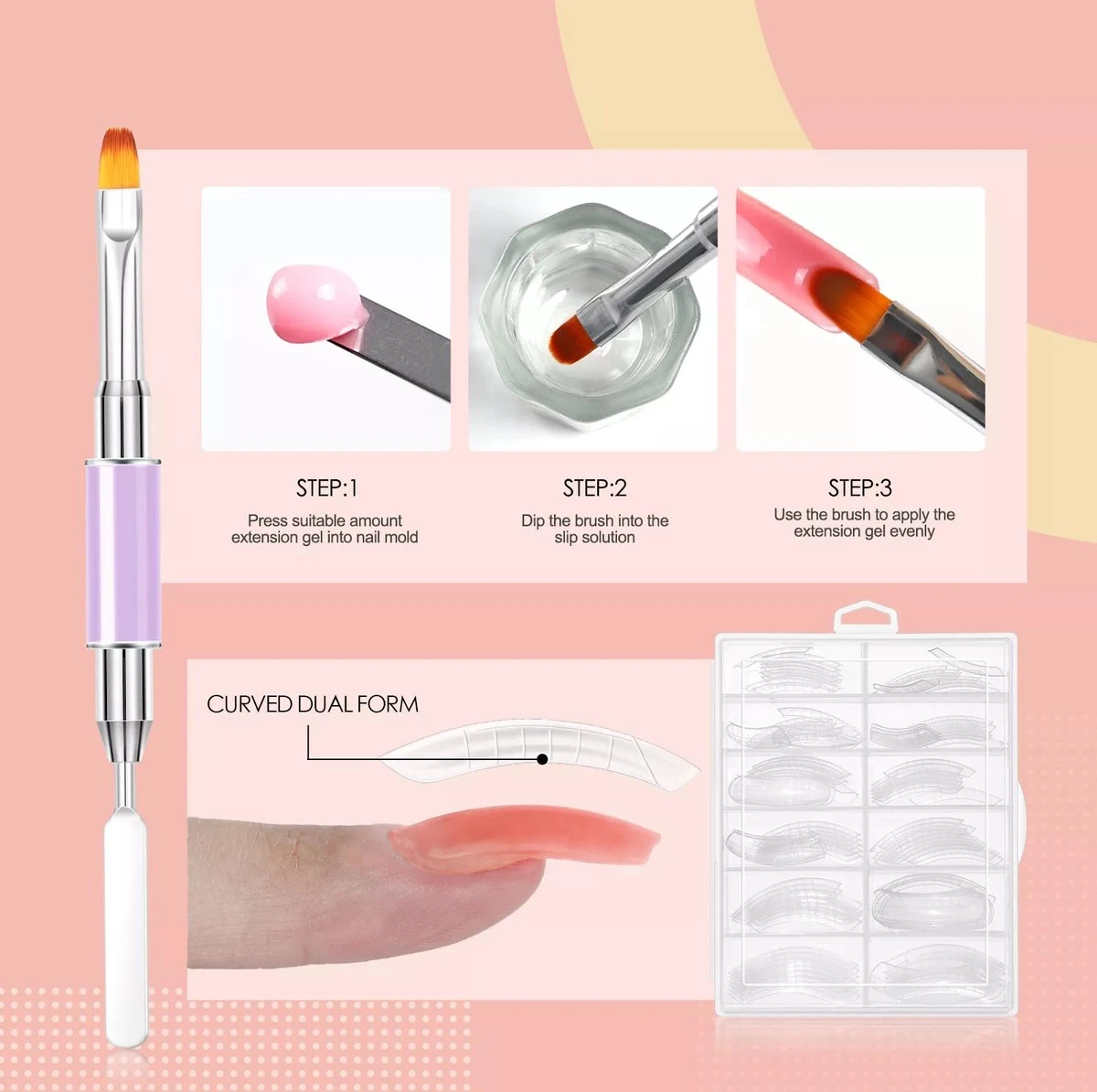 - Plaats de dual form of nageltip op de nagel en hard de polygel uit onder de UV Led Lamp